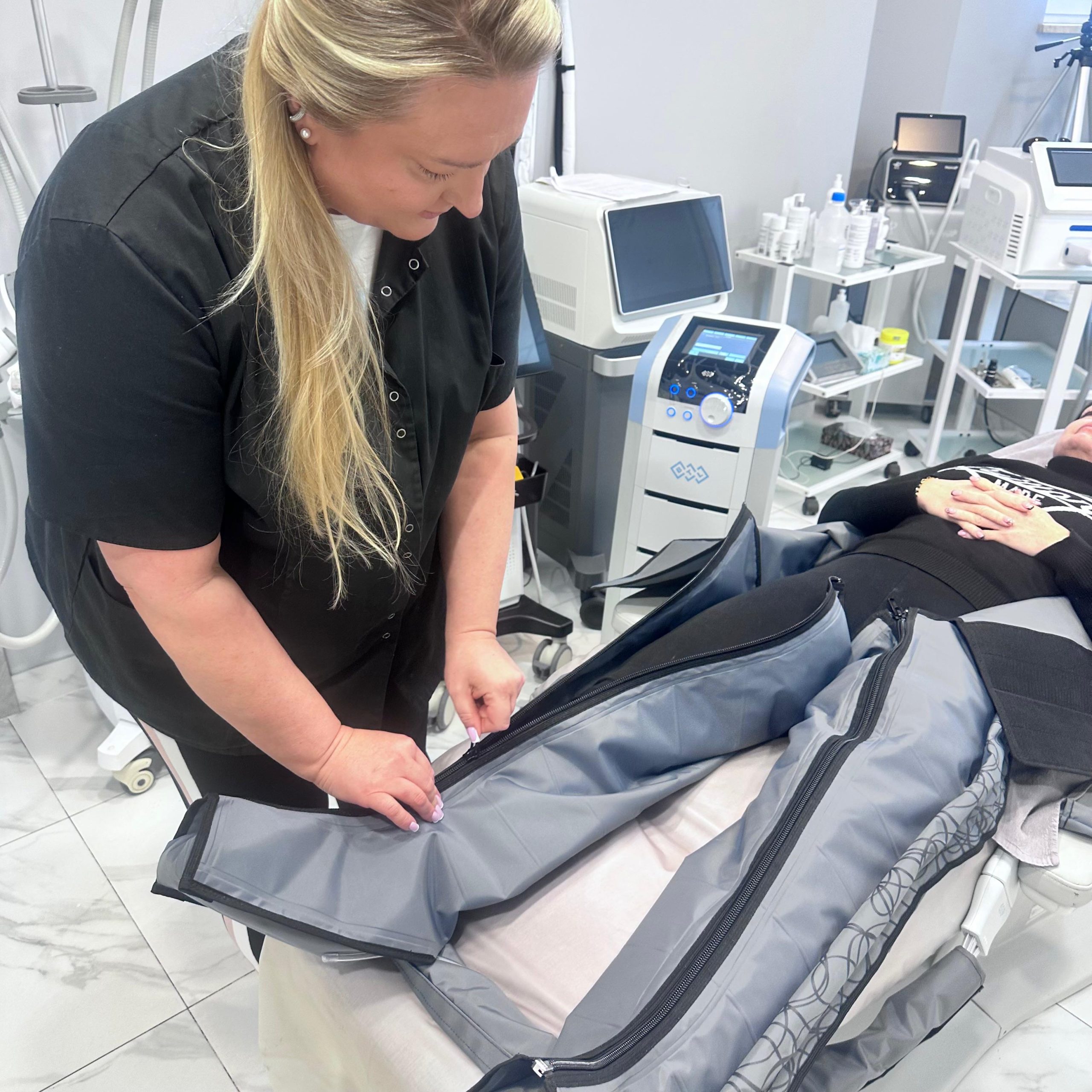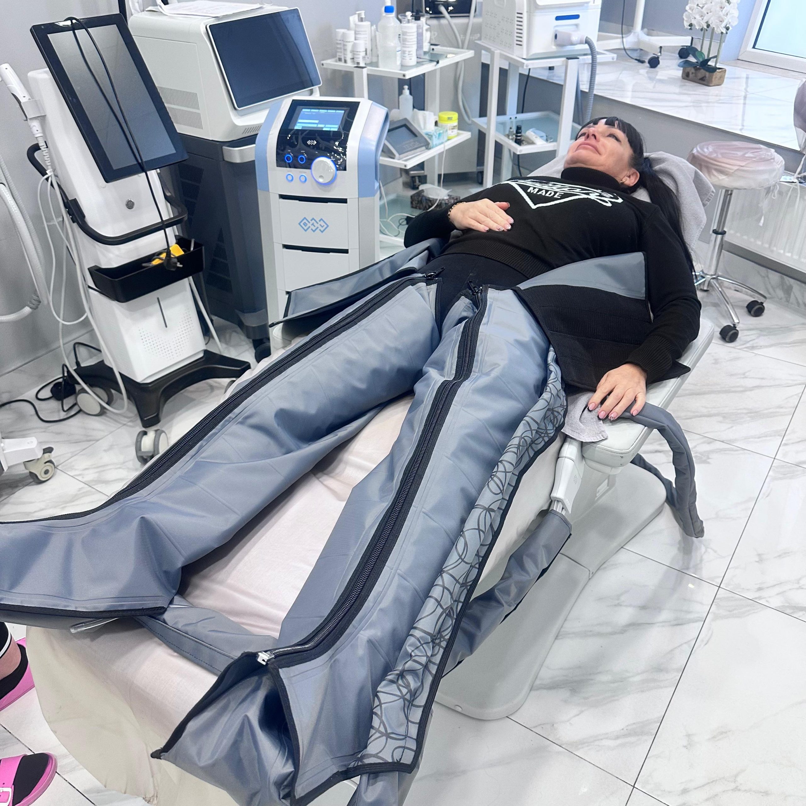 - Efektywność: Presoterapia pozwala na precyzyjne ustawienie siły ucisku i czasu trwania zabiegu, co daje intensywny efekt detoksykacji i „lekkich nóg”.